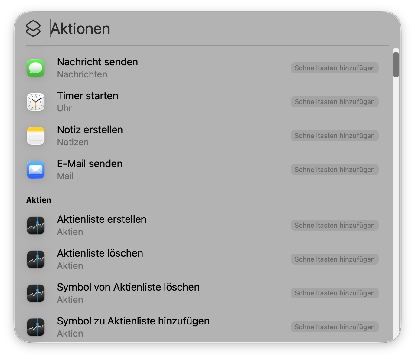 Interessant sind die Aktionen. Wie der Name erahnen lässt, besteht hierüber ein Schnellzugriff auf mehrere Aktionen, wie beispielsweise des Senden einer Nachricht oder das Erstellen einer Notiz. Um noch schneller darauf zugreifen zu können, kann man zusätzlich Schnelltasten definieren.