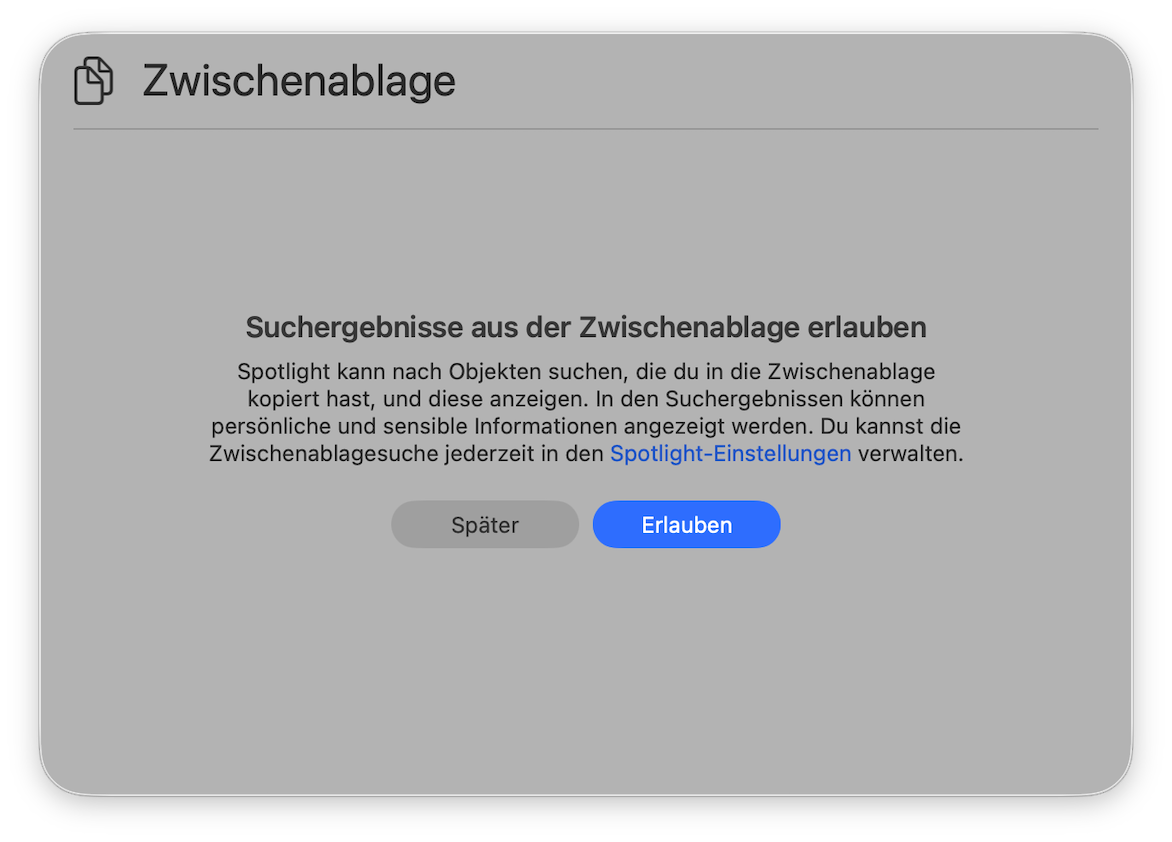 Die Suche nach Objekten, die in der Zwischenablage gespeichert wurden, funktioniert aber nur, wenn der Zugriff explizit erlaubt wurde. Auf diese Berechtigung wird beim ersten Aufruf hingewiesen.